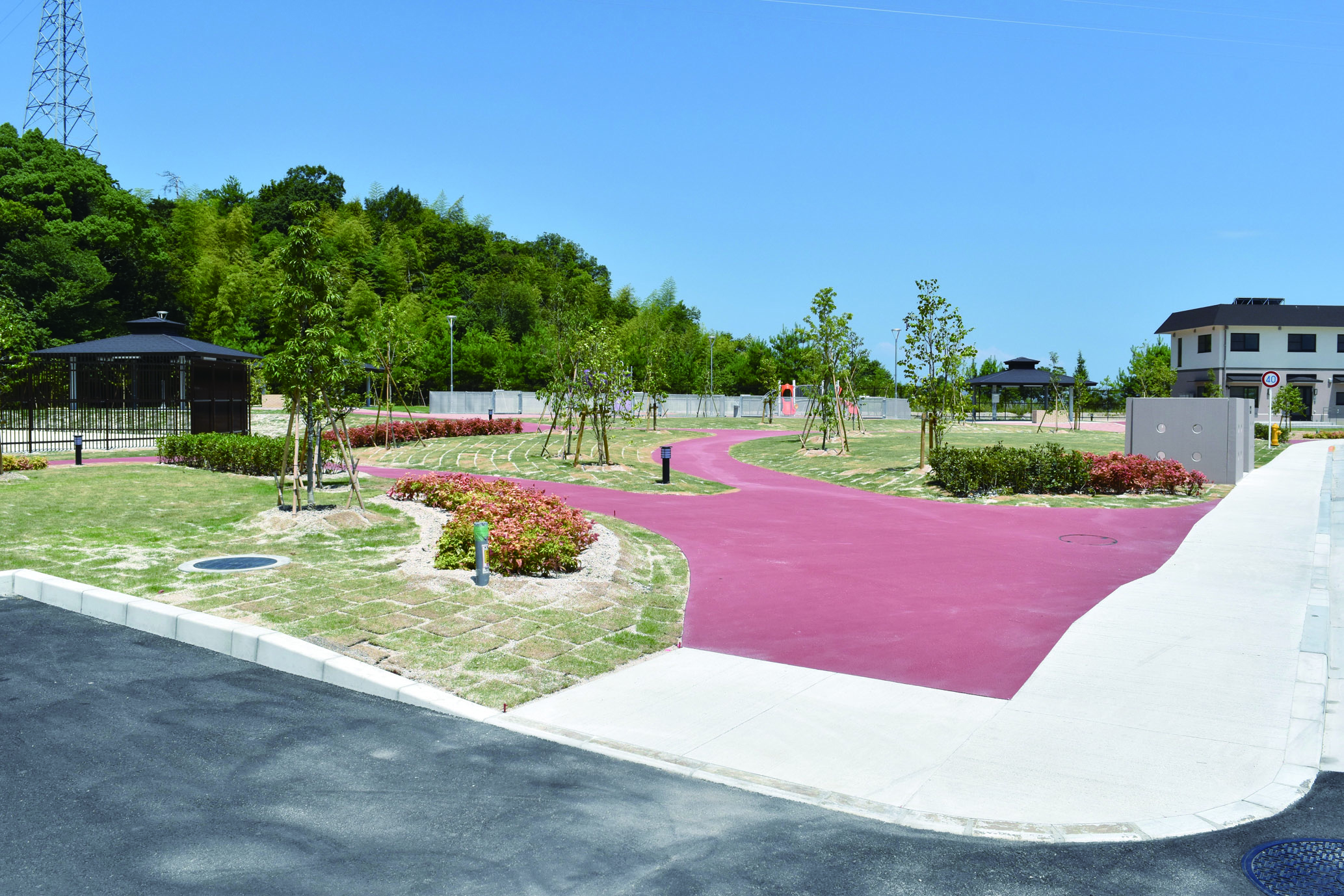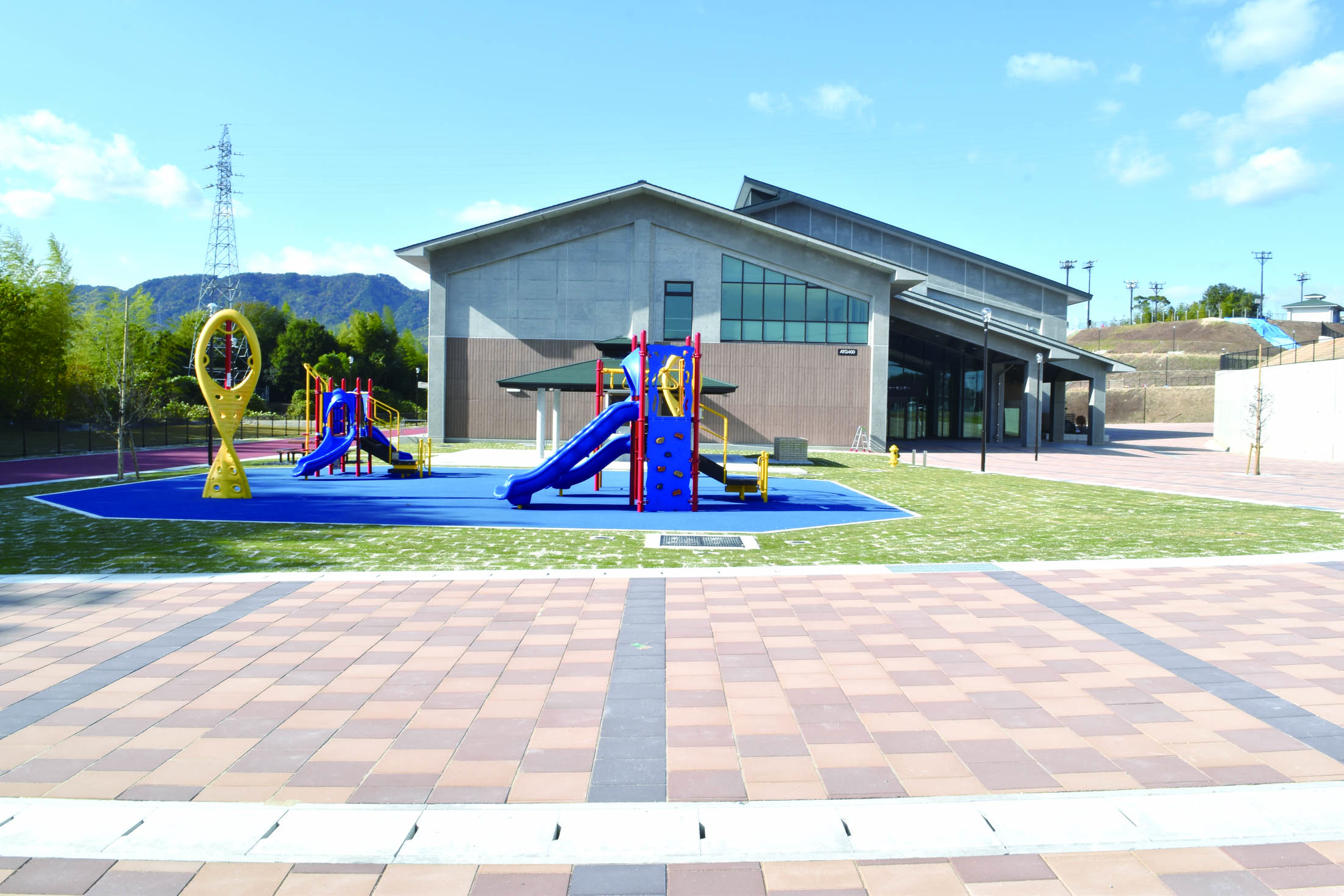 愛宕山運動施設地区内にあるコミュニティセンターの外構工事であり雨水排水、給水工事の他、 外周歩道のポリウレタン樹脂舗装工2,500㎡やインターロッキング舗装工5,200㎡、複合遊具2基などを施工しました。