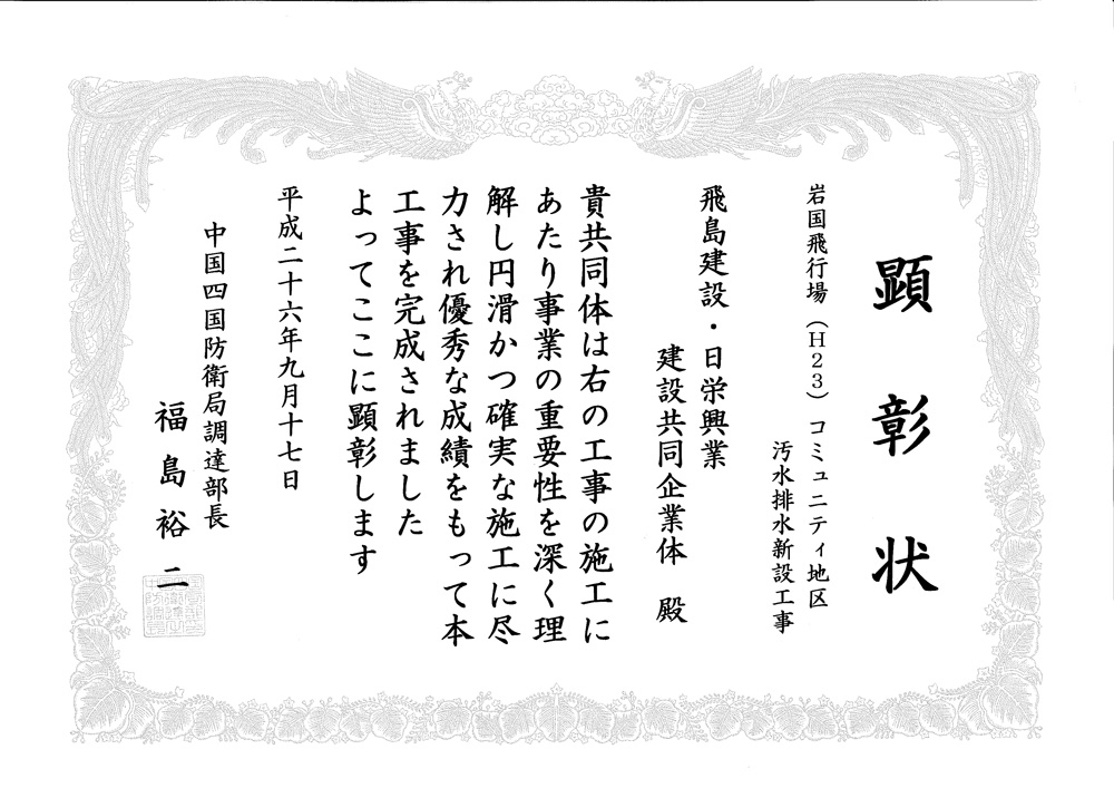 カテゴリー 表彰 平成27年・優秀工事として中国四国防衛局より表彰されました。 投稿者 作成者: act3ad 投稿日 2019年6月20日 平成27年・優秀工事として中国四国防衛局より表彰されました。 へのコメントはまだありません