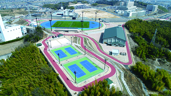 愛宕山の運動施設地区にある陸上競技場周りの外構工事の他、バスケットコート2面、テニスコート4面、サンドバレーコート2面、プレイグラウンド複合遊具3基、外周歩道のポリウレタン樹脂舗装工5,600㎡などを施工しました。